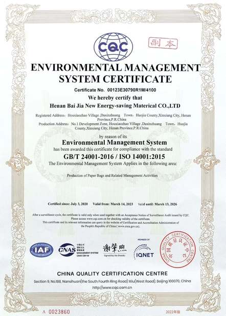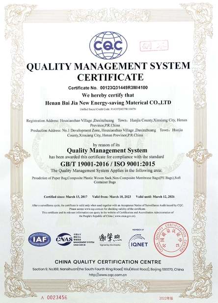 Πρότυπο:ISO22000:2005 Αριθμός:001FSMS1500170 Ημερομηνία Έκδοσης:2024-02-06 Ημερομηνία λήξης:2027-03-12 Πεδίο εφαρμογής / Range:paper bags,PE bags Που εκδίδονται από:CHINA QUALITY CERTIFICATION CENTER |